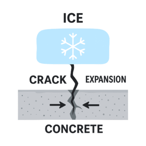 Concrete is porous, meaning it absorbs water. When that water freezes, it expands, putting pressure on the concrete from the inside. Repeated freeze–thaw cycles — especially common in colder climates — cause the surface to crack, flake, or “spall.”
